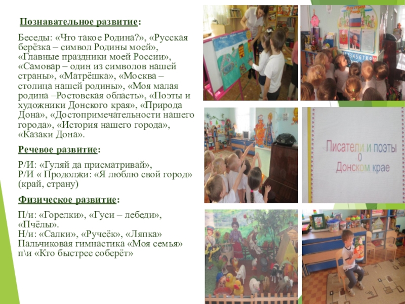 «Главные праздники моей России», «Самовар – один из символов нашей страны», «Матрёшка», «Москва – столица нашей родины», «Моя малая родина –Ростовская область», «Поэты и художники Донского края», «Природа Дона», «Достопримечательности нашего города», «История нашего города», «Казаки Дона».