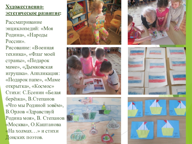 Рисование: «Военная техника», «Флаг моей страны», «Подарок маме», «Дымковская игрушка». Аппликация: «Подарок папе», «Маме открытка», «Космос» Стихи: С.Есенин «Белая берёзка», В.Степанов «Что мы Родиной зовём», В.Орлов «Здравствуй Родина моя», В. Степанов «Москва», О.Каштанова «На холмах…» и стихи Донских поэтов.