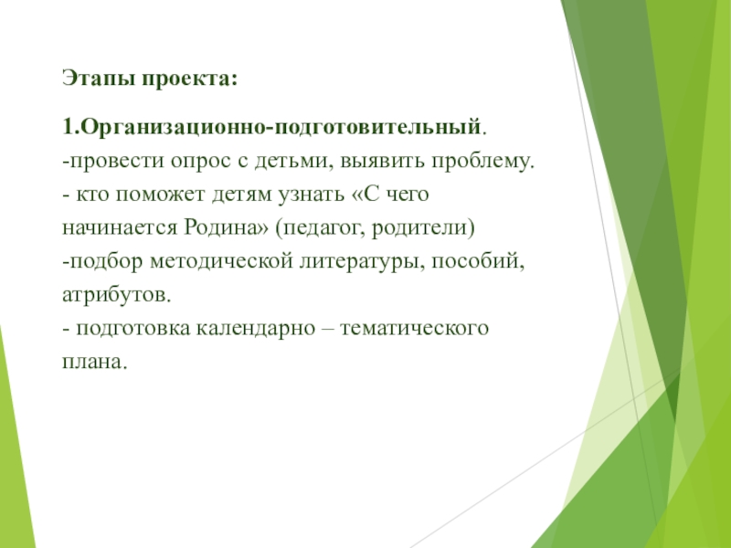 этап — подготовительный. Постановка целей, задач, составление плана работы и внедрение в воспитательно-образовательный процесс эффективных методов и приемов по расширению знаний дошкольников о семье, её происхождении, создание условий, необходимых для реализации проекта, предварительная работа с детьми, родителями (анкетирование).