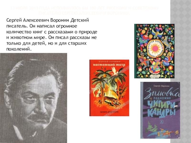 Сергей Алексеевич Воронин Детский писатель. Он написал огромное количество книг с рассказами о природе и животном мире. Он писал рассказы не только для детей, но и для старших поколений.