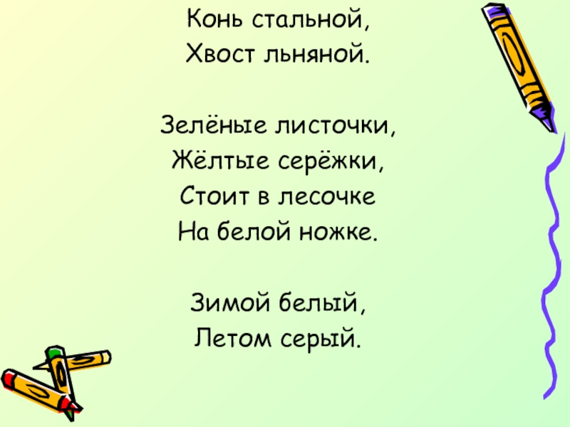 Конь стальной,Хвост льняной.Зелёные листочки,Жёлтые серёжки,Стоит в лесочкеНа белой ножке.Зимой белый,Летом серый.