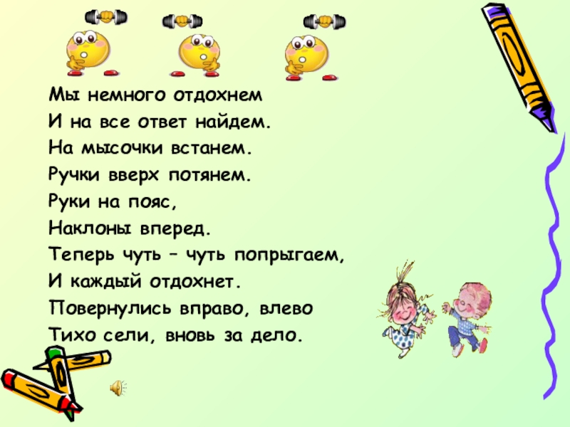 Мы немного отдохнемИ на все ответ найдем.На мысочки встанем.Ручки вверх потянем.Руки на пояс,Наклоны вперед.Теперь чуть – чуть