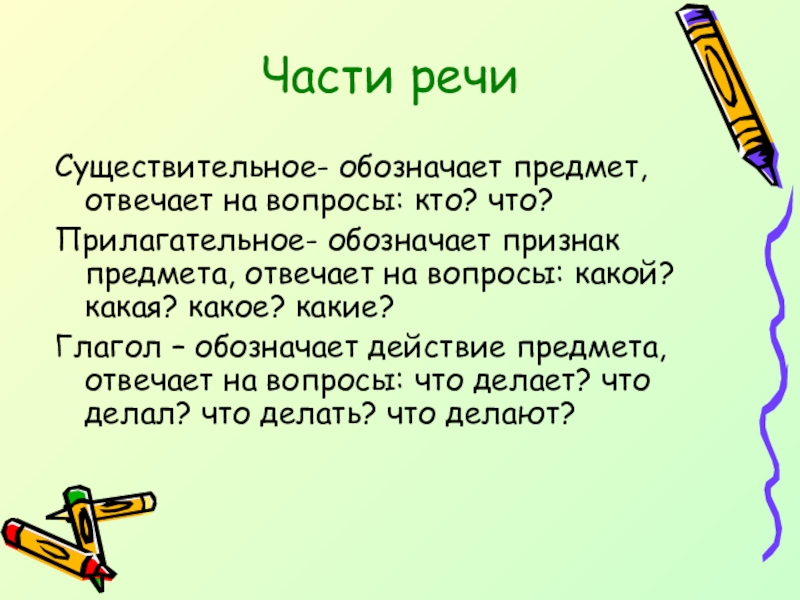 Части речиСуществительное- обозначает предмет, отвечает на вопросы: кто? что?Прилагательное- обозначает признак предмета, отвечает на вопросы: какой? какая?