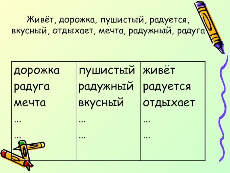 Слайд 19Живёт, дорожка, пушистый, радуется, вкусный, отдыхает, мечта, радужный, радуга