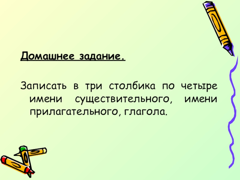 Домашнее задание. Записать в три столбика по четыре имени существительного, имени прилагательного, глагола.