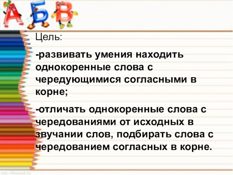 Цель:-развивать умения находить однокоренные слова с чередующимися согласными в корне; -отличать однокоренные слова с чередованиями от исходных