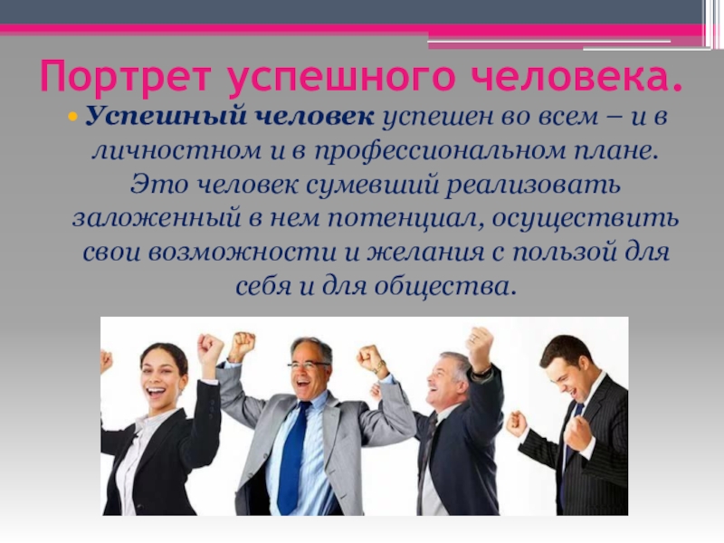 и в профессиональном плане. Это человек сумевший реализовать заложенный в нем потенциал, осуществить свои возможности и желания с пользой для себя и для общества.