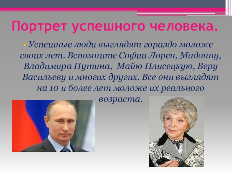 Лорен, Мадонну, Владимира Путина, Майю Плисецкую, Веру Васильеву и многих других. Все они выглядят на 10 и более лет моложе их реального возраста.