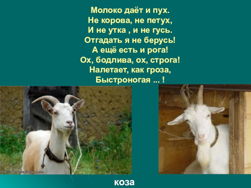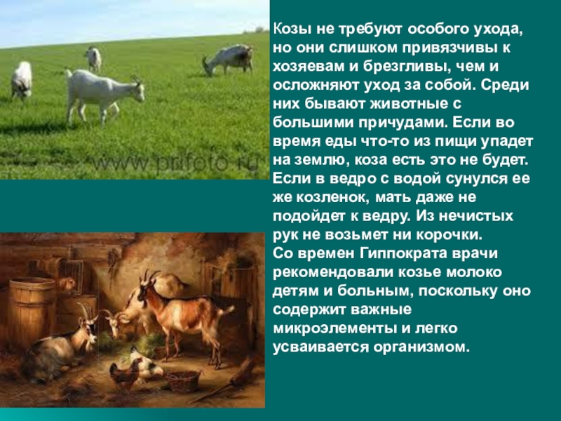 Слайд 24Козы не требуют особого ухода, но они слишком привязчивы к хозяевам
