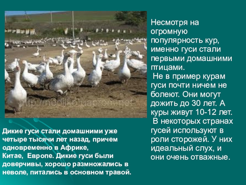 Слайд 37Несмотря на огромную популярность кур, именно гуси стали первыми домашними птицами.