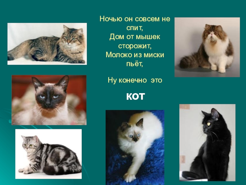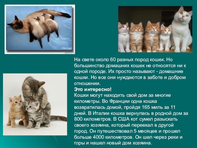 Слайд 9На свете около 60 разных пород кошек. Но большинство домашних кошек