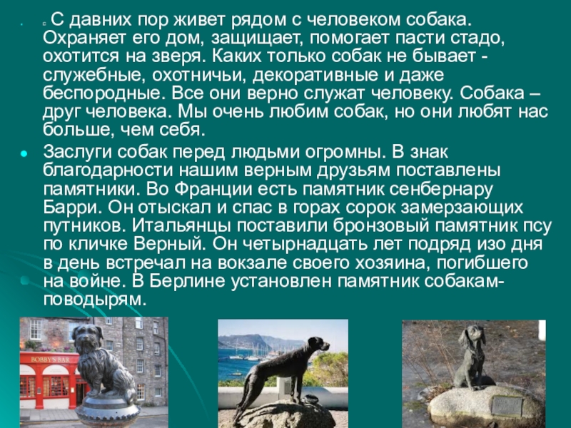 Заслуги собак перед людьми огромны. В знак благодарности нашим верным друзьям поставлены памятники. Во Франции есть памятник сенбернару Барри. Он отыскал и спас в горах сорок замерзающих путников. Итальянцы поставили бронзовый памятник псу по кличке Верный. Он четырнадцать лет подряд изо дня в день встречал на вокзале своего хозяина, погибшего на войне. В Берлине установлен памятник собакам-поводырям.