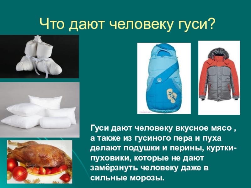 из гусиного пера и пуха делают подушки и перины, куртки-пуховики, которые не дают замёрзнуть человеку даже в сильные морозы.