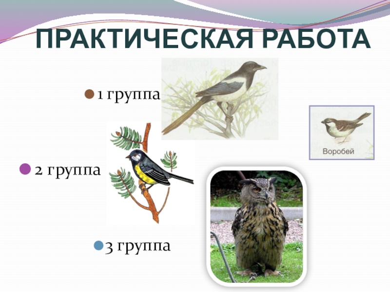 ПРАКТИЧЕСКАЯ РАБОТА    ОПИШИ ПТИЦУ ПО ПЛАНУ:1. величина (в сравнении с воробьём);2. окраска головы, спины,