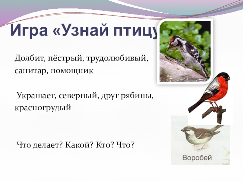 Игра «Узнай птицу»Долбит, пёстрый, трудолюбивый, санитар, помощник Украшает, северный, друг рябины,красногрудый Что делает? Какой? Кто? Что?