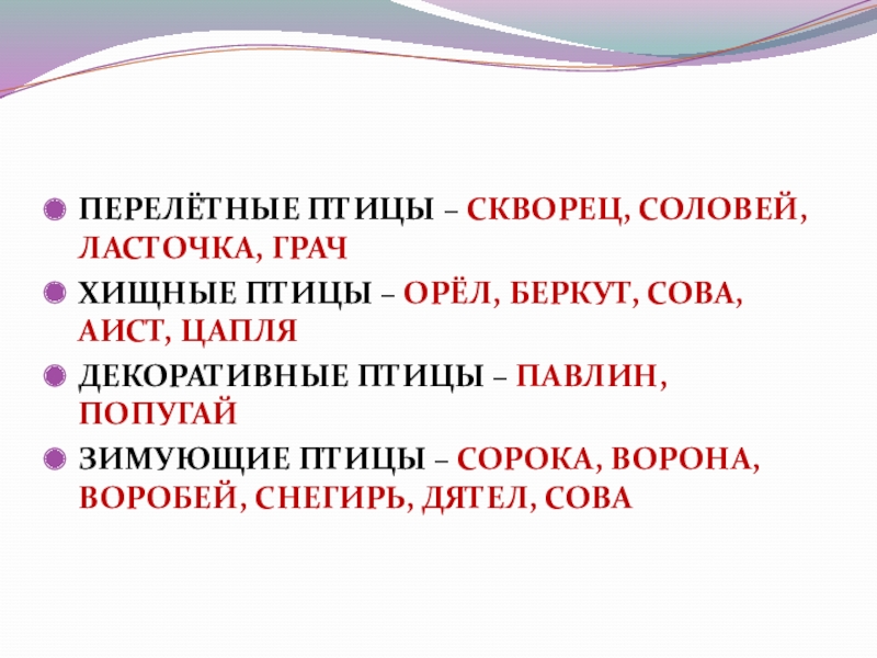 ПЕРЕЛЁТНЫЕ ПТИЦЫ – СКВОРЕЦ, СОЛОВЕЙ, ЛАСТОЧКА, ГРАЧХИЩНЫЕ ПТИЦЫ – ОРЁЛ, БЕРКУТ, СОВА, АИСТ, ЦАПЛЯДЕКОРАТИВНЫЕ ПТИЦЫ – ПАВЛИН,