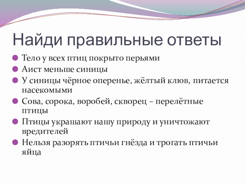Найди правильные ответыТело у всех птиц покрыто перьямиАист меньше синицыУ синицы чёрное оперенье, жёлтый клюв, питается насекомымиСова,