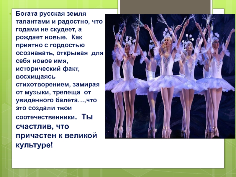 а рождает новые. Как приятно с гордостью осознавать, открывая для себя новое имя, исторический факт, восхищаясь стихотворением, замирая от музыки, трепеща от увиденного балета…,что это создали твои соотечественники. Ты счастлив, что причастен к великой культуре!