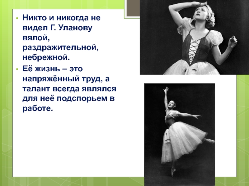 Никто и никогда не видел Г. Уланову вялой, раздражительной, небрежной.