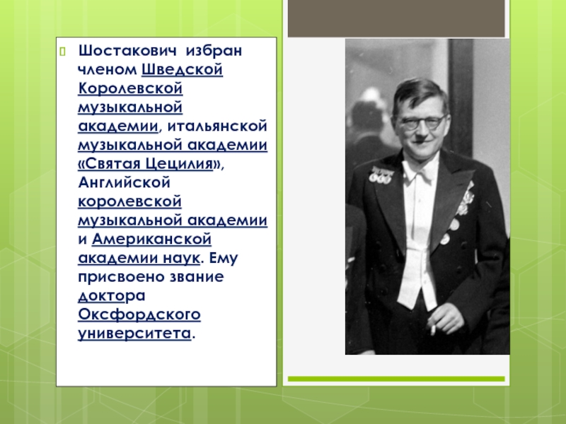 Слайд 19Шостакович избран членом Шведской Королевской музыкальной академии, итальянской музыкальной академии «Святая