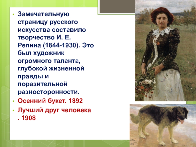 Замечательную страницу русского искусства составило творчество И. Е. Репина (1844-1930). Это