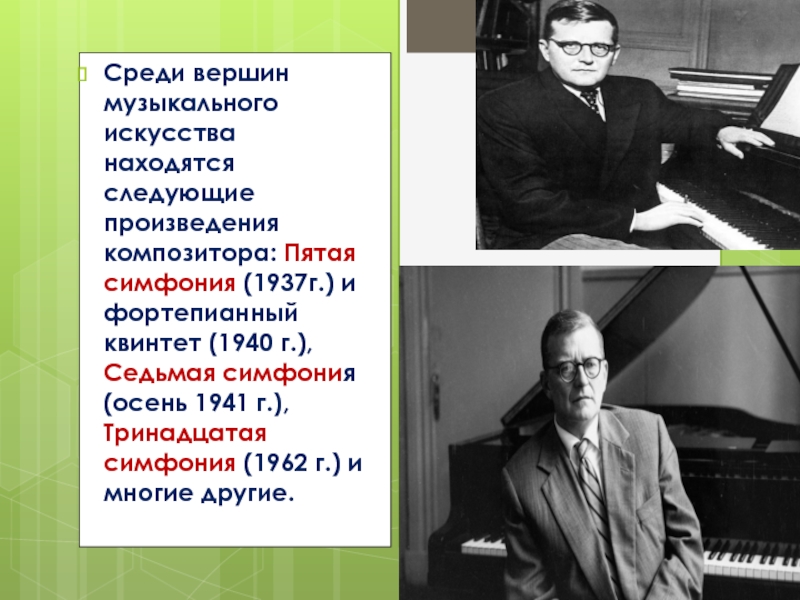 и фортепианный квинтет (1940 г.), Седьмая симфония(осень 1941 г.), Тринадцатая симфония (1962 г.) и многие другие.