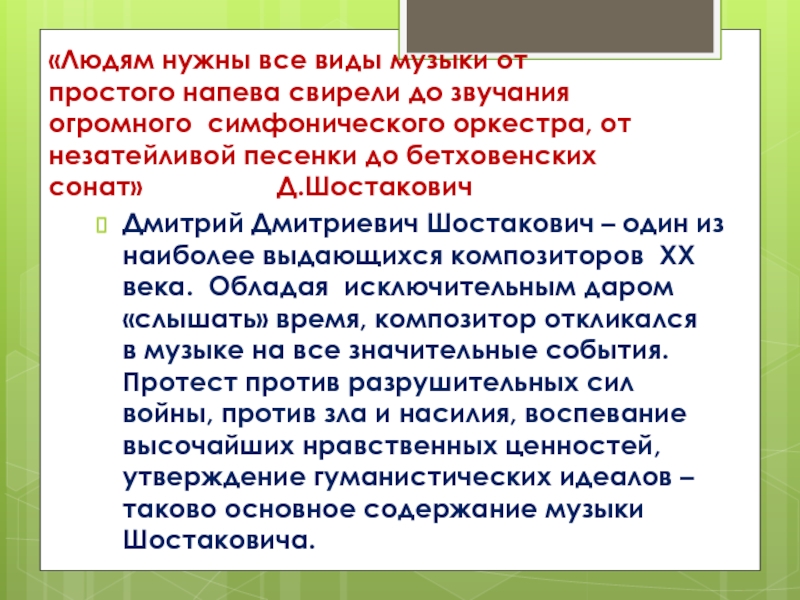 Дмитрий Дмитриевич Шостакович – один из наиболее выдающихся композиторов XX века. Обладая исключительным даром «слышать» время, композитор откликался в музыке на все значительные события. Протест против разрушительных сил войны, против зла и насилия, воспевание высочайших нравственных ценностей, утверждение гуманистических идеалов – таково основное содержание музыки Шостаковича.