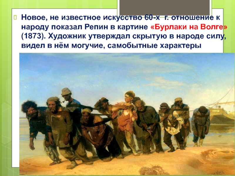 в картине «Бурлаки на Волге» (1873). Художник утверждал скрытую в народе силу, видел в нём могучие, самобытные характеры