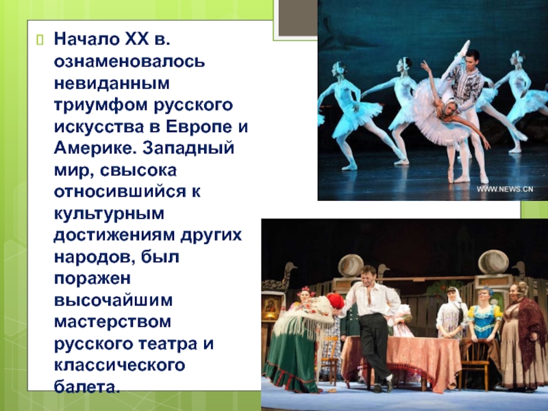 Америке. Западный мир, свысока относившийся к культурным достижениям других народов, был поражен высочайшим мастерством русского театра и классического балета.