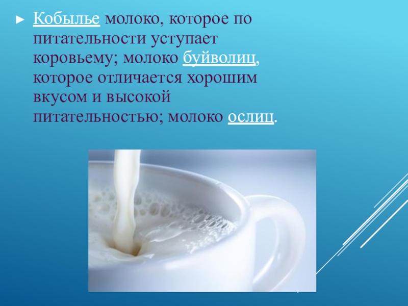 Слайд 13Кобылье молоко, которое по питательности уступает коровьему; молоко буйволиц, которое отличается