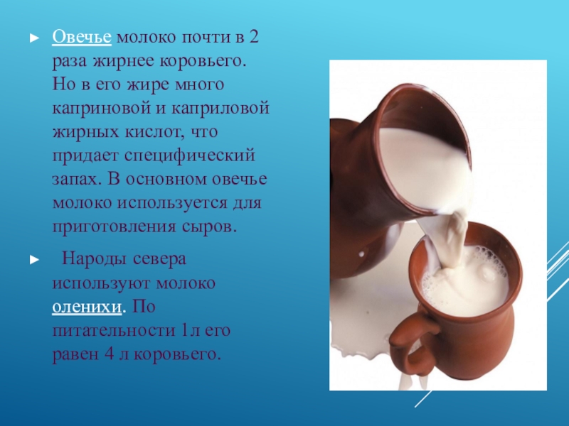 Слайд 12Овечье молоко почти в 2 раза жирнее коровьего. Но в его