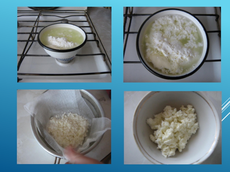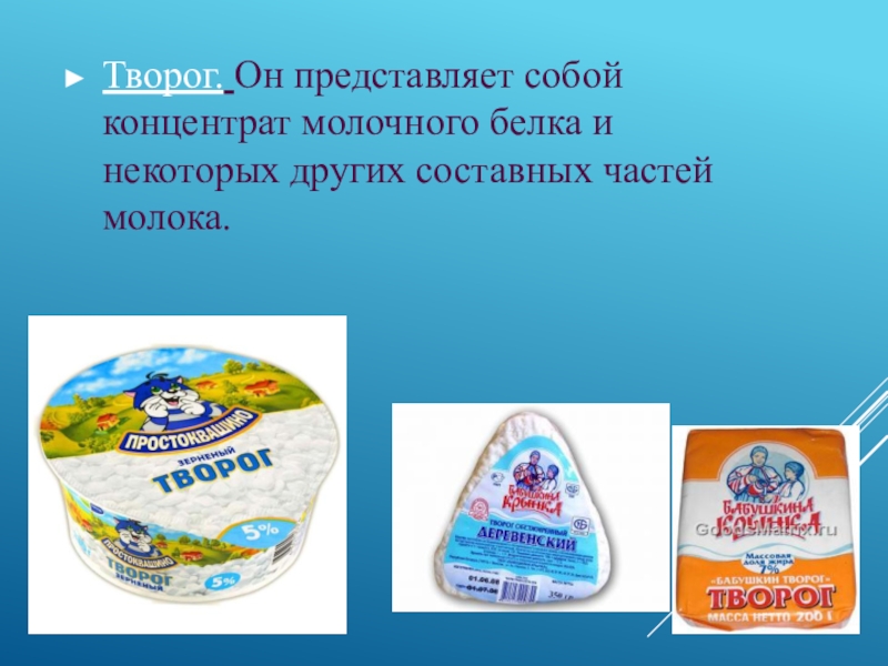 Слайд 15Творог. Он представляет собой концентрат молочного белка и некоторых других составных