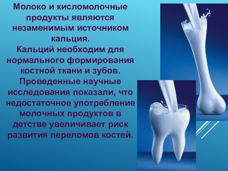 Слайд 9Молоко и кисломолочные продукты являются незаменимым источником кальция.