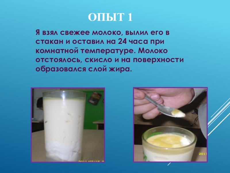 оставил на 24 часа при комнатной температуре. Молоко отстоялось, скисло и на поверхности образовался слой жира.