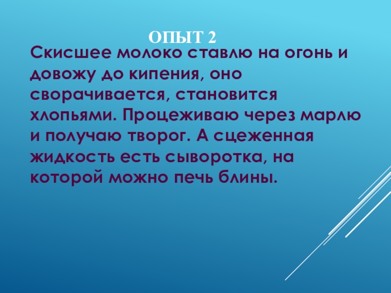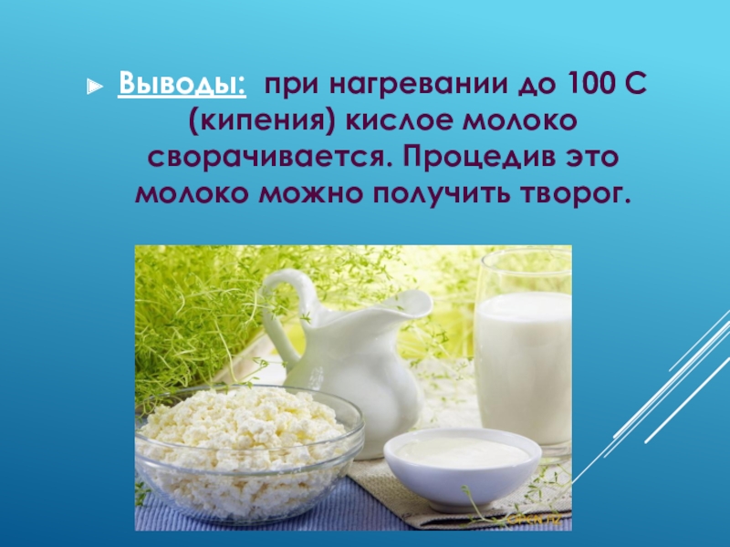 Слайд 24Выводы: при нагревании до 100 С (кипения) кислое молоко сворачивается. Процедив