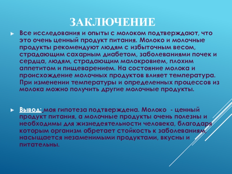 Вывод: моя гипотеза подтверждена. Молоко - ценный продукт питания, а молочные продукты очень полезны и необходимы для жизнедеятельности человека, благодаря которым организм обретает стойкость к заболеваниям, насыщается незаменимыми продуктами, вкусны и питательны.