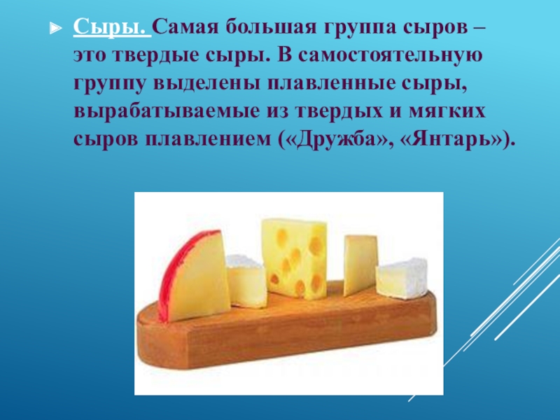 Слайд 18Сыры. Самая большая группа сыров – это твердые сыры. В самостоятельную