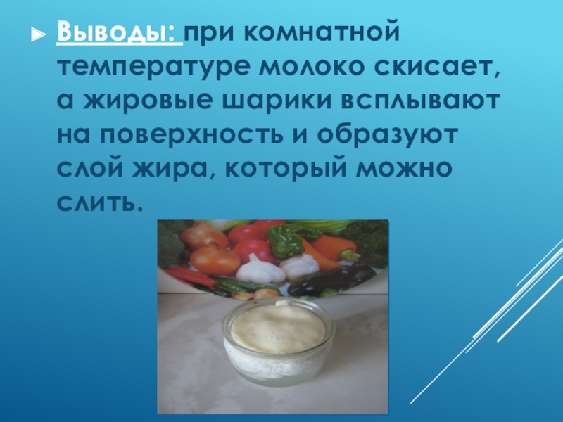 Слайд 21Выводы: при комнатной температуре молоко скисает, а жировые шарики всплывают на