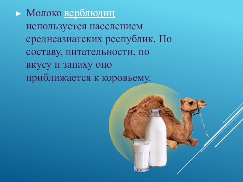 Слайд 11Молоко верблюдиц используется населением среднеазиатских республик. По составу, питательности, по вкусу