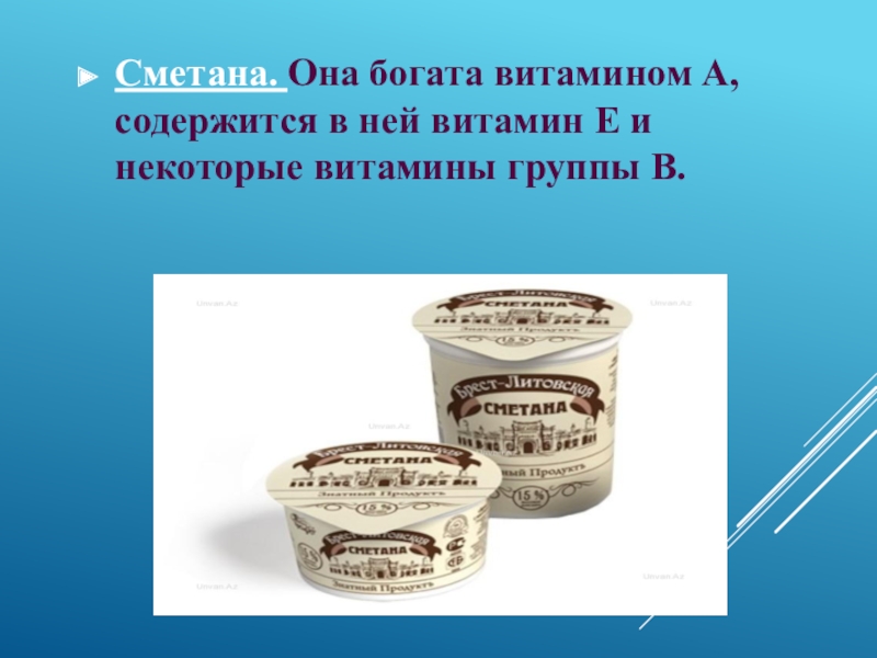Слайд 16Сметана. Она богата витамином А, содержится в ней витамин Е и