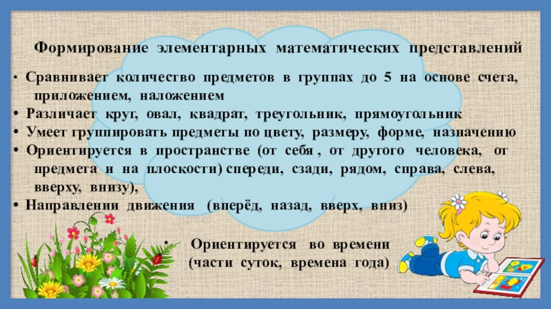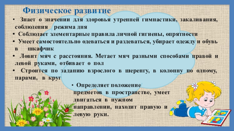 Определяет положение предметов в пространстве, умеет двигаться в нужном направлении, находит правую и левую руки.