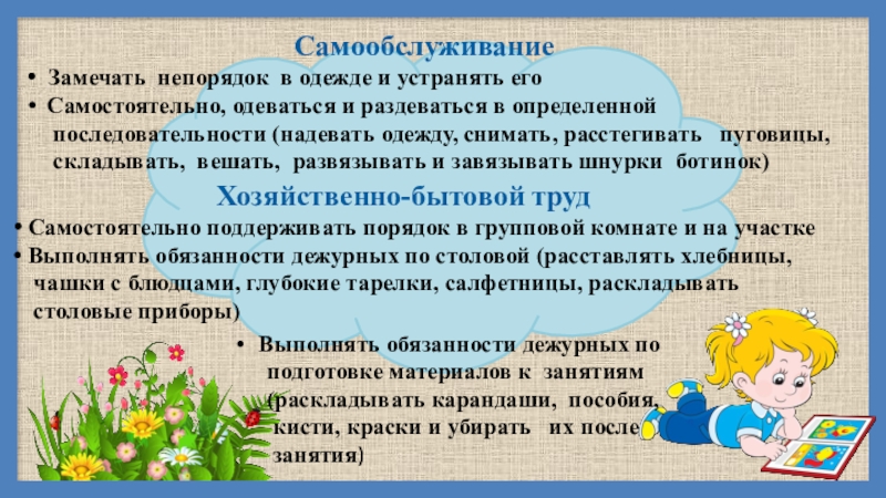 Самостоятельно поддерживать порядок в групповой комнате и на участке