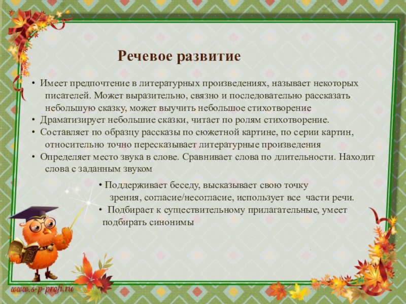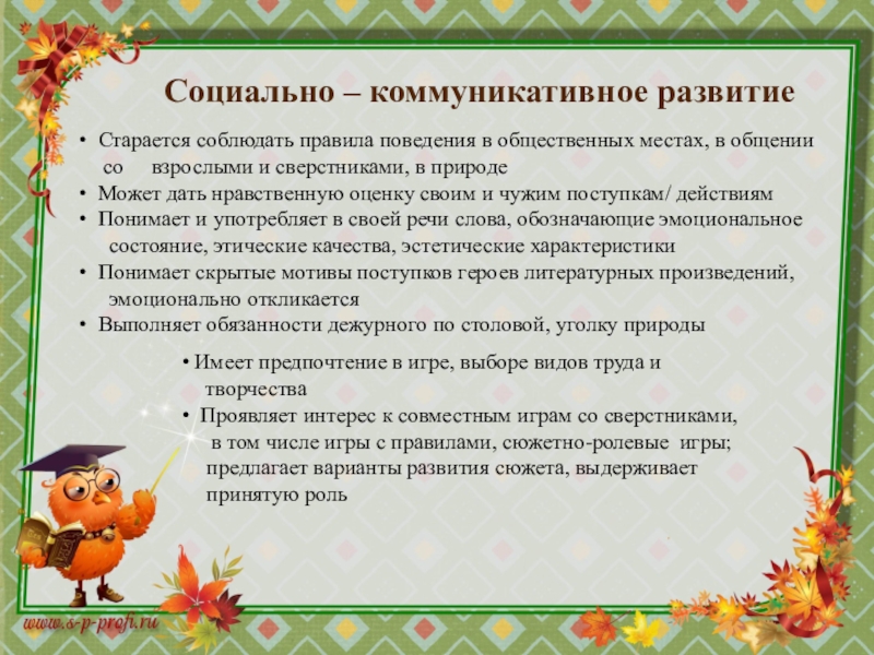 в том числе игры с правилами, сюжетно-ролевые игры; предлагает варианты развития сюжета, выдерживает принятую роль