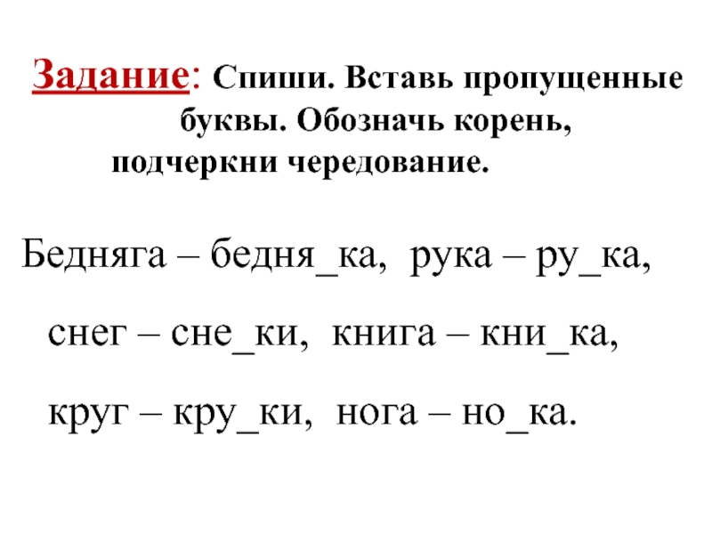 Бедняга – бедня_ка, рука – ру_ка, снег – сне_ки, книга – кни_ка, круг – кру_ки, нога – но_ка.