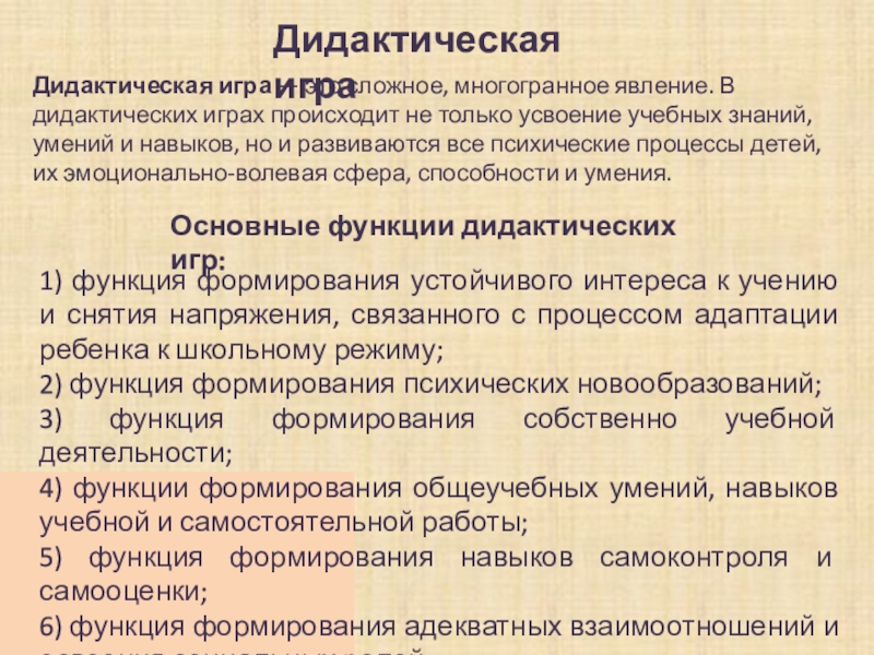 Дидактическая игра — это сложное, многогранное явление. В дидактических играх происходит не только усвоение учебных знаний, умений и навыков, но и развиваются все психические процессы детей, их эмоционально-волевая сфера, способности и умения.