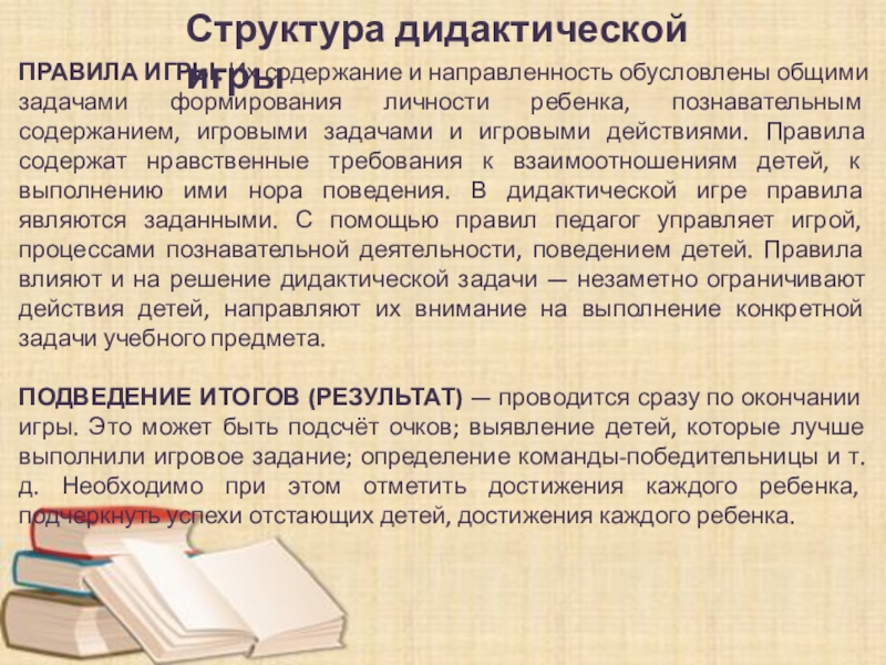 формирования личности ребенка, познавательным содержанием, игровыми задачами и игровыми действиями. Правила содержат нравственные требования к взаимоотношениям детей, к выполнению ими нора поведения. В дидактической игре правила являются заданными. С помощью правил педагог управляет игрой, процессами познавательной деятельности, поведением детей. Правила влияют и на решение дидактической задачи — незаметно ограничивают действия детей, направляют их внимание на выполнение конкретной задачи учебного предмета.