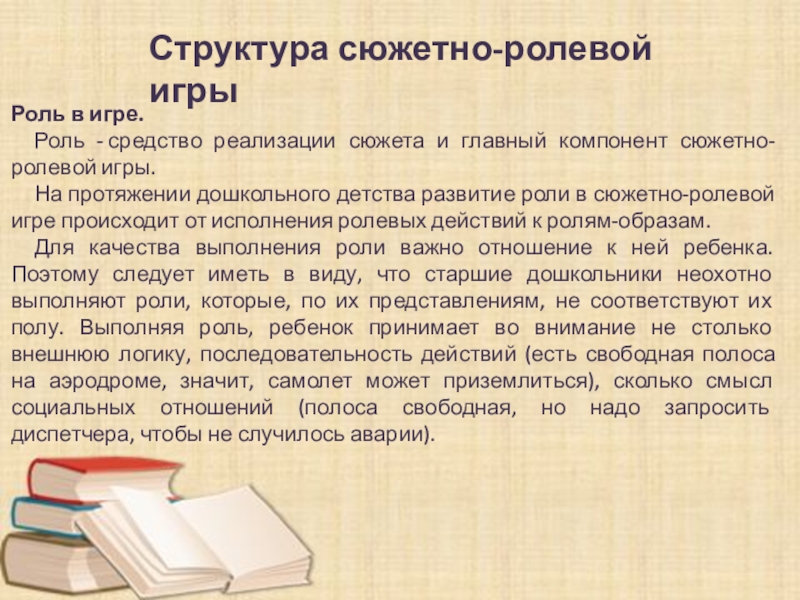 Для качества выполнения роли важно отношение к ней ребенка. Поэтому следует иметь в виду, что старшие дошкольники неохотно выполняют роли, которые, по их представлениям, не соответствуют их полу. Выполняя роль, ребенок принимает во внимание не столько внешнюю логику, последовательность действий (есть свободная полоса на аэродроме, значит, самолет может приземлиться), сколько смысл социальных отношений (полоса свободная, но надо запросить диспетчера, чтобы не случилось аварии).