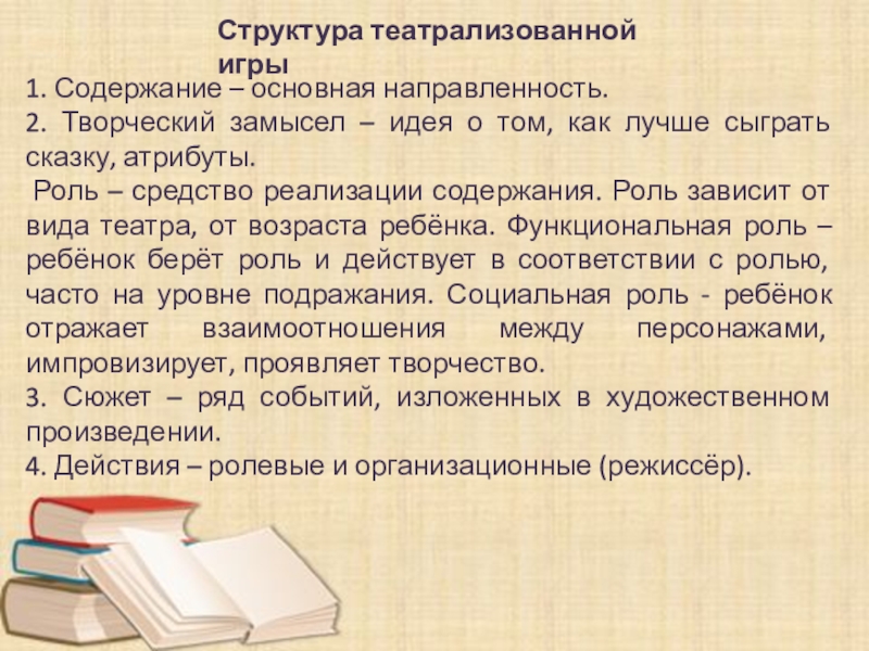 Роль – средство реализации содержания. Роль зависит от вида театра, от возраста ребёнка. Функциональная роль – ребёнок берёт роль и действует в соответствии с ролью, часто на уровне подражания. Социальная роль - ребёнок отражает взаимоотношения между персонажами, импровизирует, проявляет творчество.