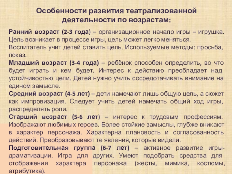 Слайд 15Особенности развития театрализованной деятельности по возрастам: