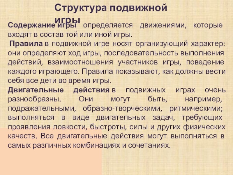 Правила в подвижной игре носят организующий характер: они определяют ход игры, последовательность выполнения действий, взаимоотношения участников игры, поведение каждого играющего. Правила показывают, как должны вести себя все дети во время игры.